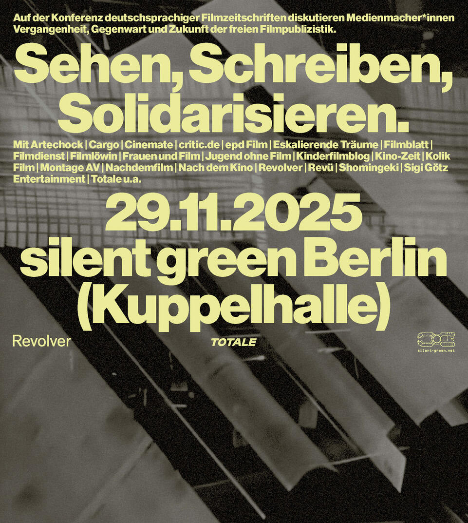 Gertrud Koch15.00 hGespräch: „Blick zurück nach Vorn”Geschichte und Geschichten verschwundener Zeitschriften. Im Fokus steht die Frage, welche historischen Bedingungen, Themen oder Anliegen zum Auf- oder Abblühen von Zeitschrift-Projekten führen.Gertrud Koch (ehem. Frauen und Film u.a.), Rolf Aurich (Deutsche Kinemathek, ehem. Filmwärts), Rainer Knepperges (ehem. Gdinetmao, New Filmkritik).Moderation: Hannah Pilarczyk16.00 hDialogische Ermutigung: „Wie gründe ich eine Filmzeitschrift?”Von der ersten Idee bis hin zum tatsächlichen Heft liegen vielfache Möglichkeitsräume, die es zu gestalten gilt. Von Ausrichtung und Titelfindung, über Rechtsform und grafischer Gestaltung bis hin zur Vertriebsstrategie – kurz und knapp beleuchten wir die zentralen Schritte zur Gründung eines Printmagazins.Friederike Dietrich & Rahel Jung (TOTALE)16.30 hPause16.45 hImpuls: „Sprachlos vor lauter Bildern: Von Filmen schreiben”Patrick Holzapfel (Jugend ohne Film)17:30 hPanel: „Wollen & Wirken”Filmzeitschriften als Werkzeuge im politischen Kampf: Was lässt sich mit Filmzeitschriften erreichen, was nicht? Welche Ziele verfolgt die gegenwärtige Filmpublizistik?Mit Annette Brauerhoch (Frauen und Film), Christoph Hochhäusler (Revolver), Vera Klocke (Podcast „Fashion the Gaze”).Moderation: Matthias Dell.18.30 hGespräch: „In der Lücke zwischen Bild und Text. Trilog über das Schreiben.”Doris Kuhn (Süddeutsche Zeitung, Werkstattkino), Lukas Foerster (critic.de) und Anne Küper (div. Medien) im Gespräch.19.15 hPanel: „Widening the Scope: International Perspectives”Film magazines are an expression of lived film culture. How do cultural differences influence editorial practices? How much sway do film magazines have on public opinion and the formation of canons in other parts of the world?^With Mark Peranson (curator, writer, filmmaker, „Cinema Scope”), Nele Wohlatz (filmmaker, Buenos Aires & Berlin) and Maël Mubalegh (writer, filmmaker „Rayon Vert”, „Revü”, „Apaches” and others).Hosted by Nicolas Wackerbarth (Revolver).In English language.20.15 hAusklang, Umtrunk mit Musik22.00 hEnde